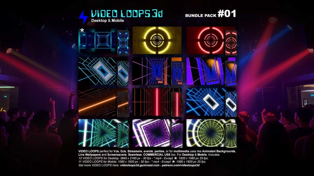 VIDEO LOOPS 3D - BUNDLE PACK #01. Desktop & Mobile. High Quality. No Watermarks. Perfect for VJs, DJs, Streamers, events, parties, or for multimedia uses like Animated Backgrounds, Live Wallpapers and Screensavers, etc. For commercial use too.