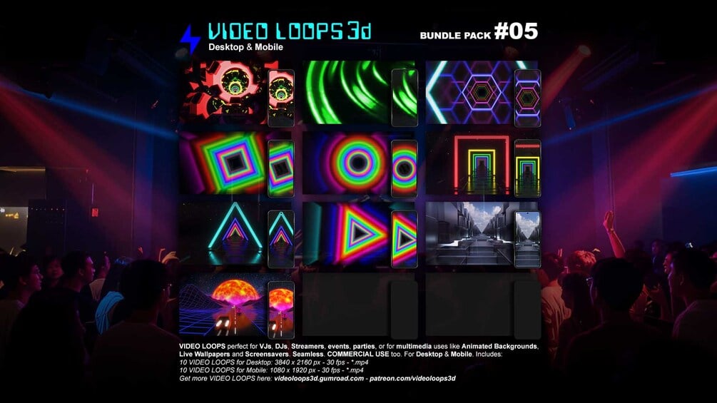 VIDEO LOOPS 3D - BUNDLE PACK #05. Desktop & Mobile. High Quality. No Watermarks. Perfect for VJs, DJs, Streamers, events, parties, or for multimedia uses like Animated Backgrounds, Live Wallpapers and Screensavers, etc. For commercial use too.